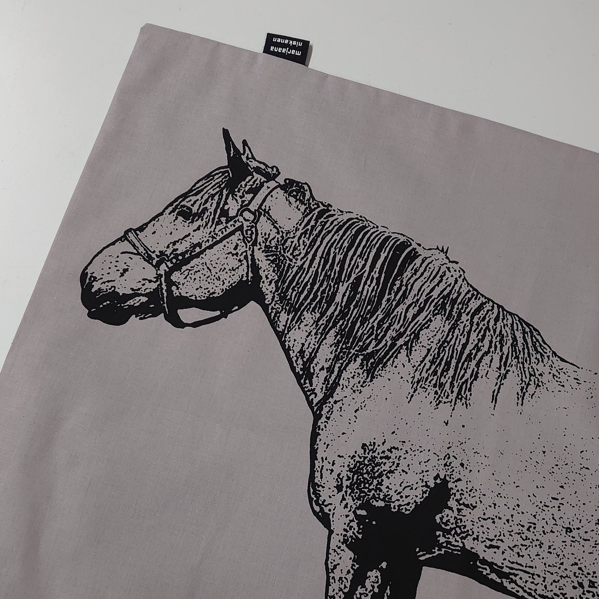 Kauniita unia, Loukon Lotan turvassa rauhoittavia yöunia. Tyynyliinan kuva painettu käsin ja tuote ommeltu Marjaanan työhuoneella Viitasaarella. Kankaan väri on hennosti lilaan taittava vaaleanharmaa, painoväri musta. Tyynyliinassa painettuna yksi iso printti, jonka kohdistus voi hieman vaihdella tuotteittain.